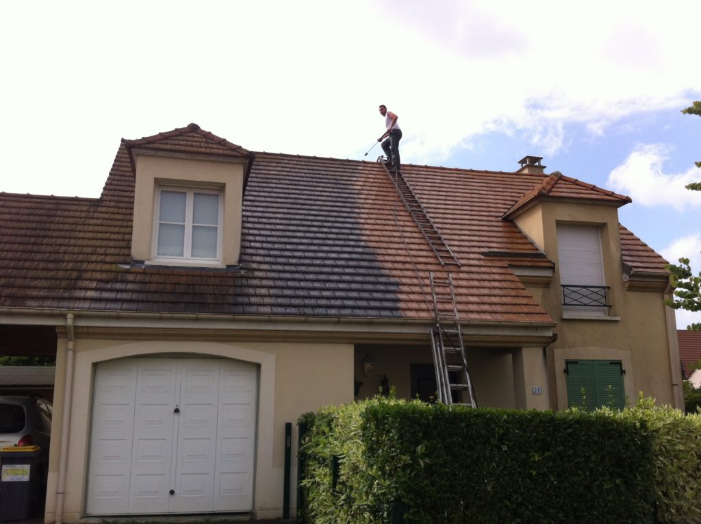 Photo ci dessus : Gary Gauthier est en train de réaliser un démoussage toiture sur une maison dans le 91 (Essonne).